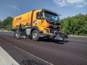 Die Brock Kehrmaschine ist am Heck mit einer Rotorcleaner-Einheit ausgerüstet, die auch mit hartnäckigstem Schmutz fertig wird und Fahrbahnen porentief reinigt. Dazu arbeiten die Düsen, die den Asphalt reinigen, mit einem Wasserdruck von bis zu 300 Bar – das ist ein Spitzenwert für Reinigungsaggregate dieser Art. Wir setzen sie vor allem auf Autobahnbaustellen ein, auf denen gerade eine neue Betondecke aufgebracht worden ist. Denn die Erstreinigung einer neuen Asphaltfläche ist äußerst wichtig, damit der „frische Asphalt“ durch verunreinigende Partikel nicht in Mitleidenschaft gezogen und beschädigt wird.
